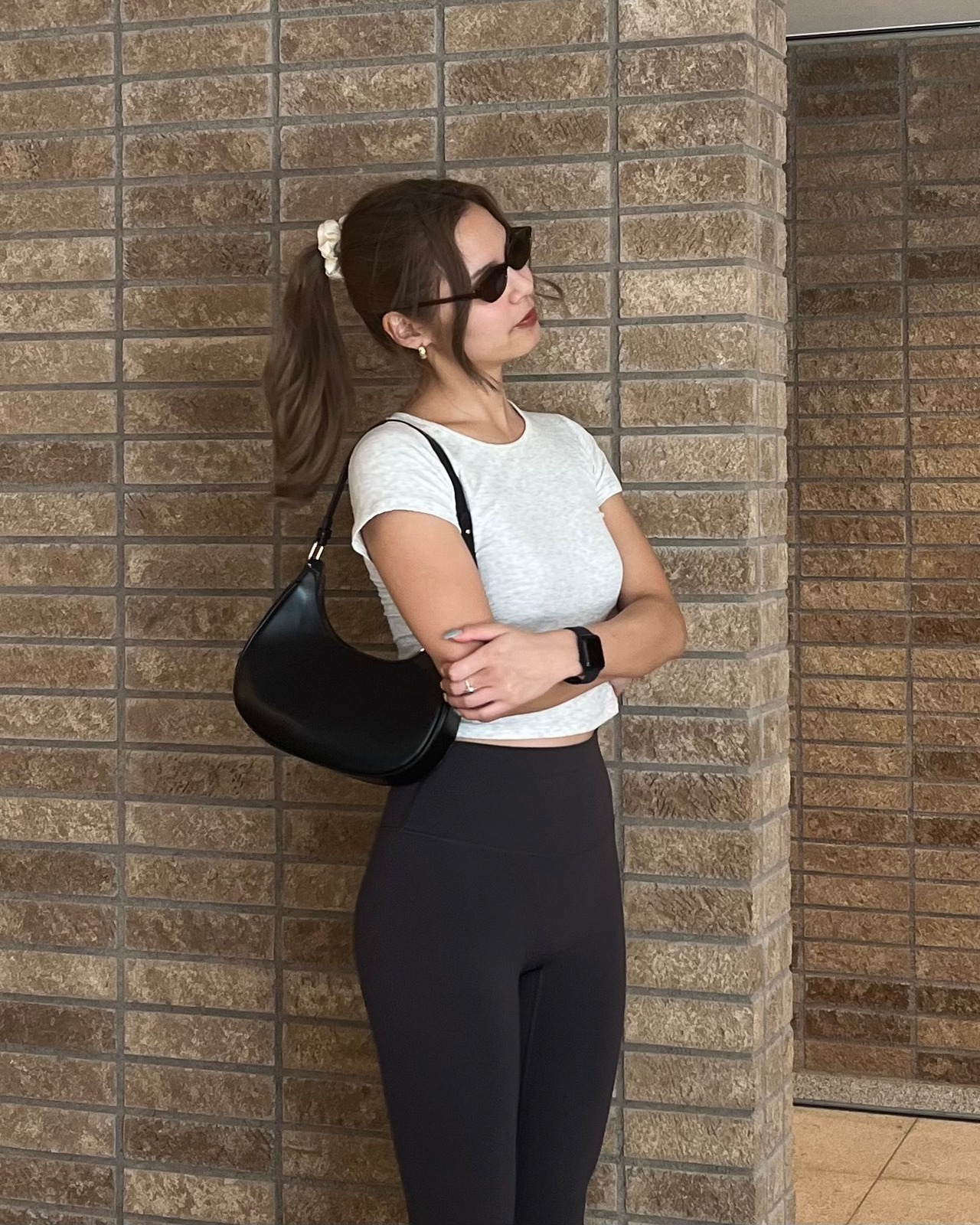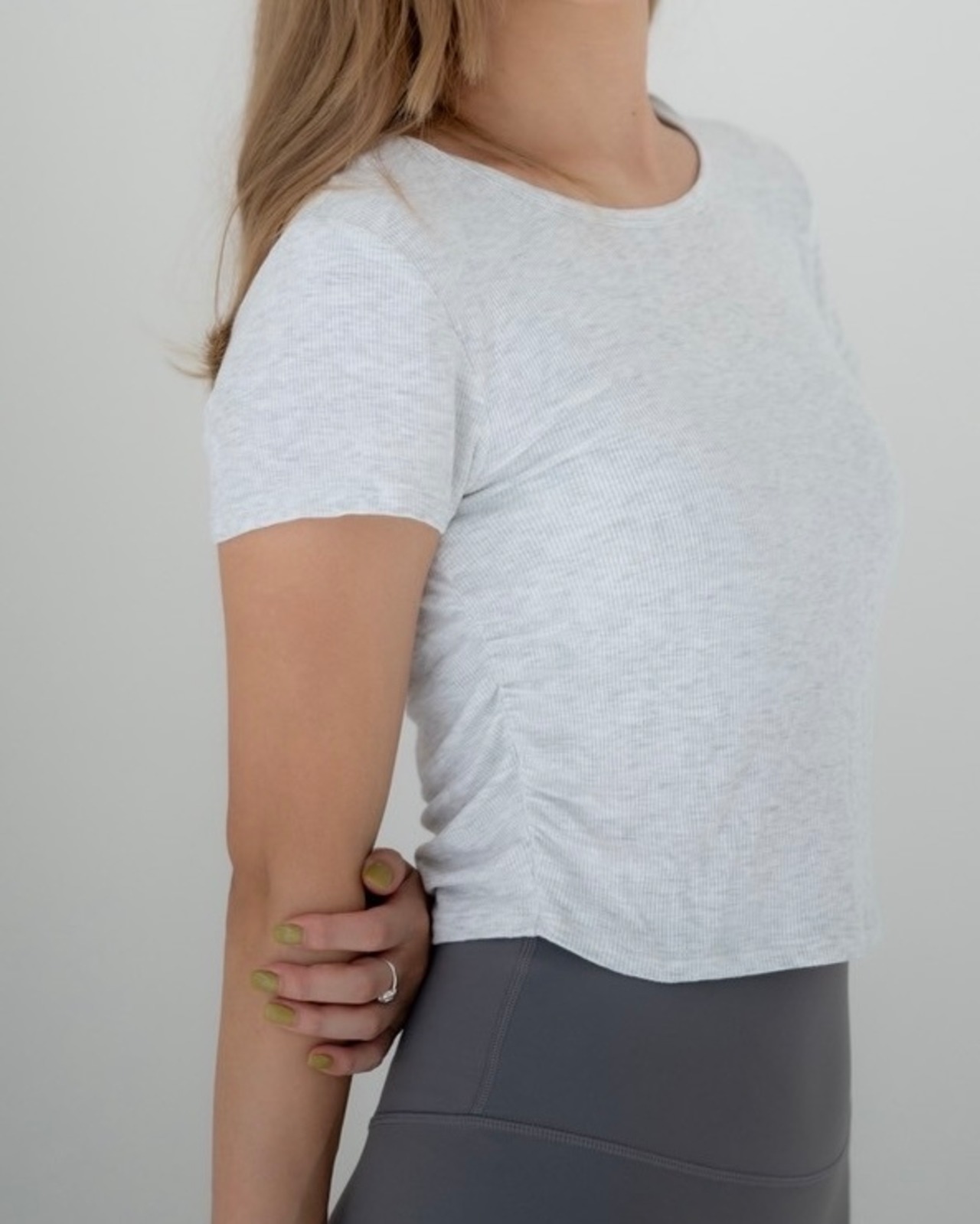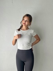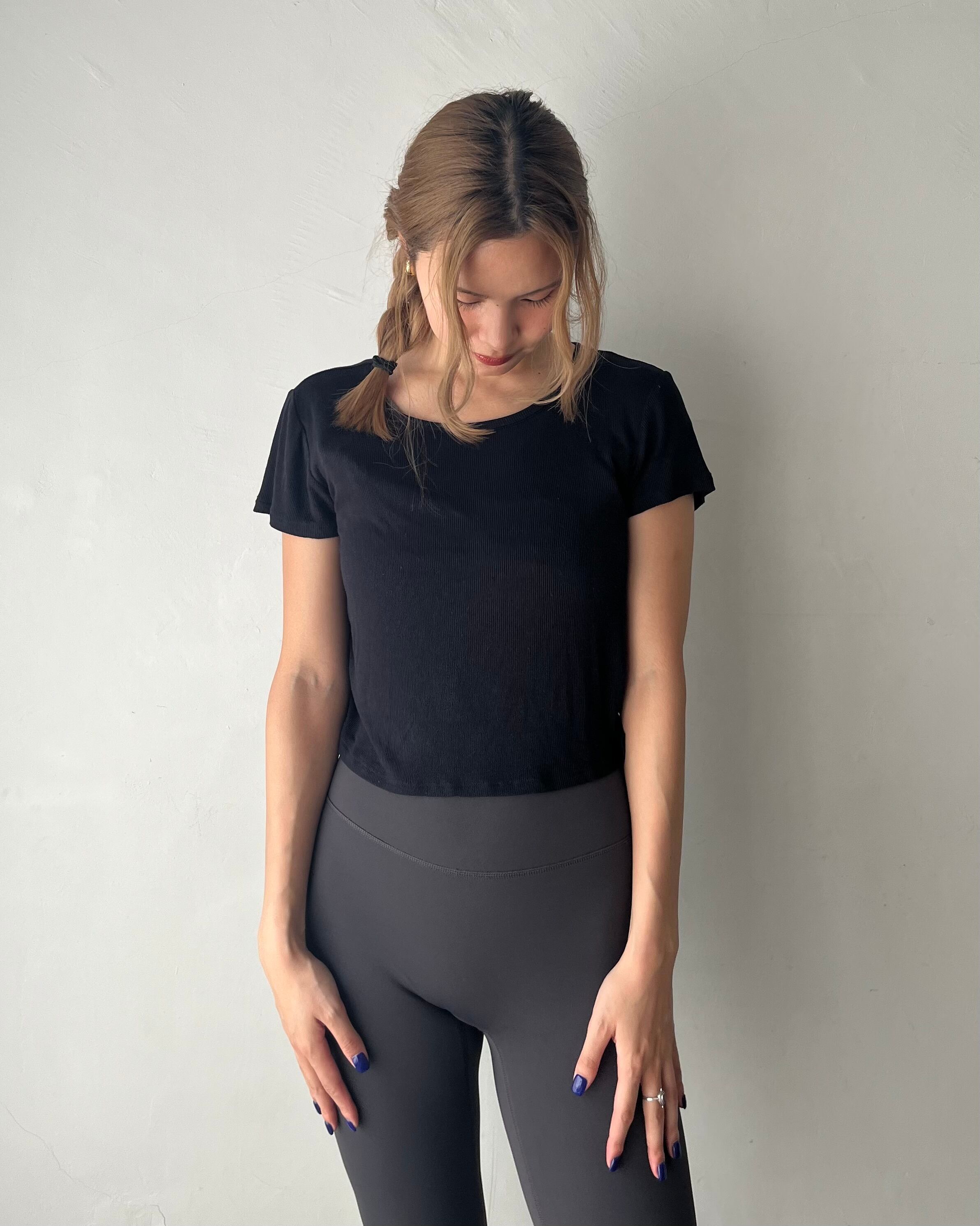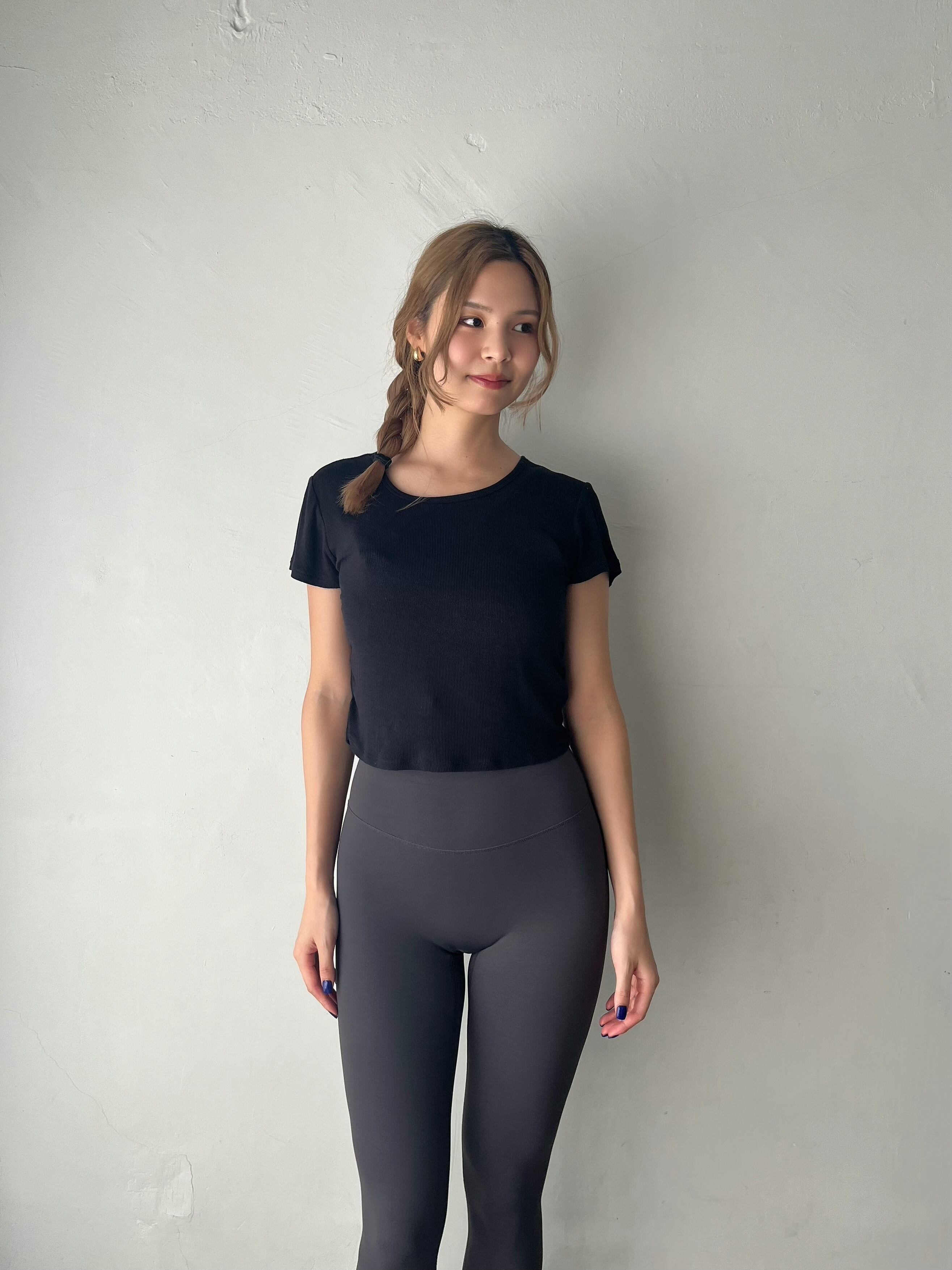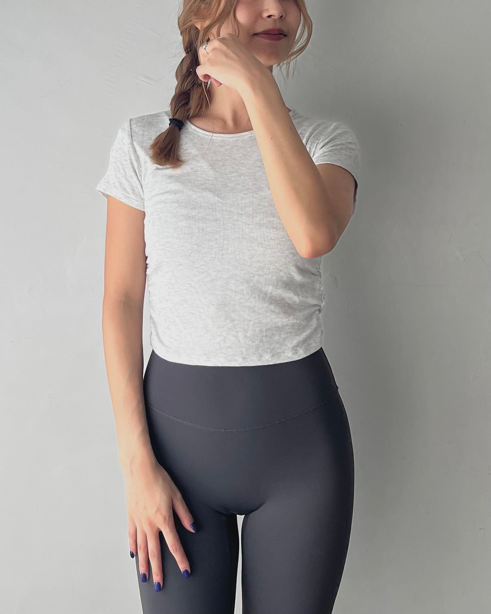横にギャザーがあり、なんとなくウエストが細く見える。ピチピチすぎず身体にフィットするサイズ感。スタイルが良く見えるクロップド丈。