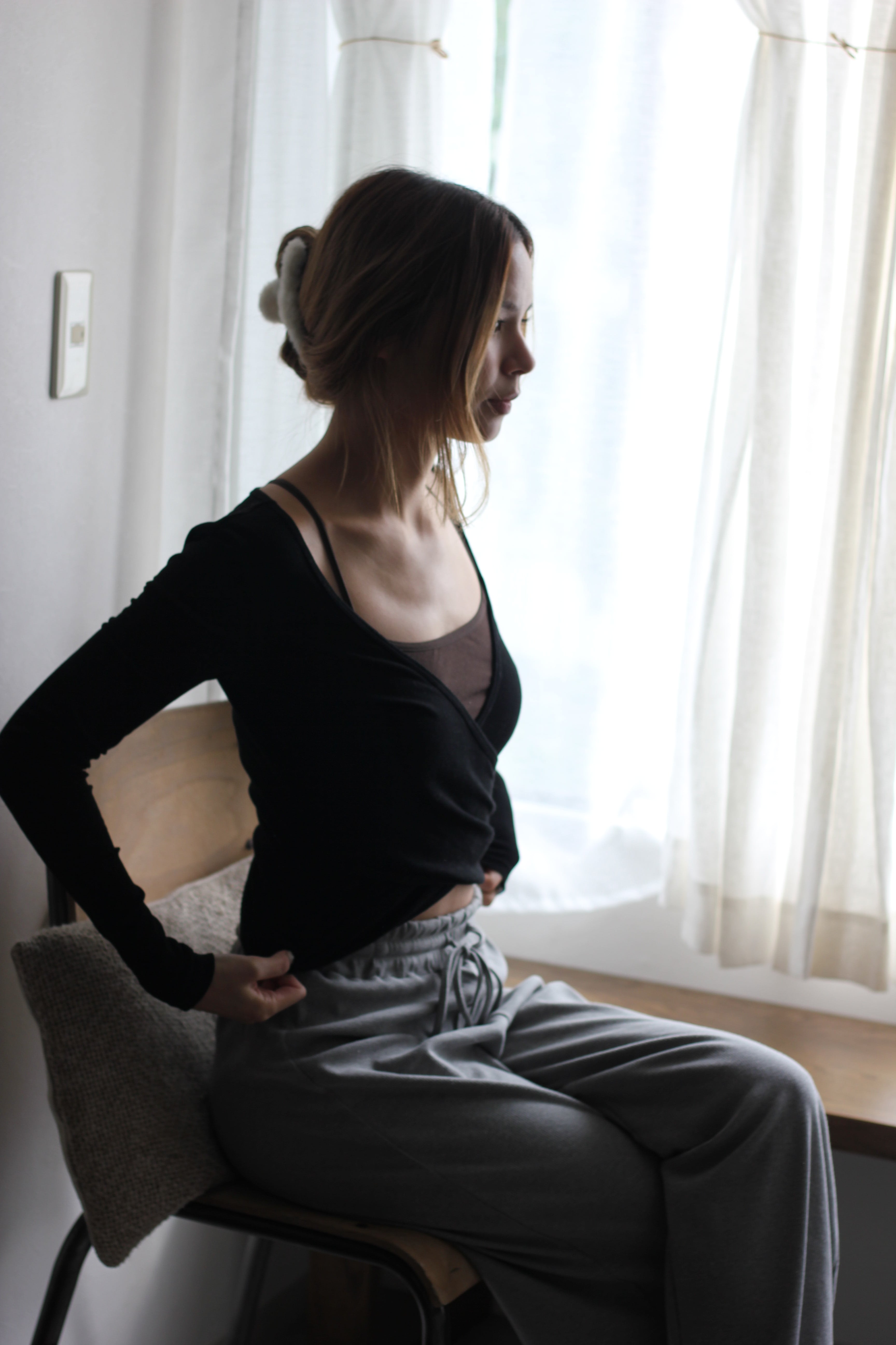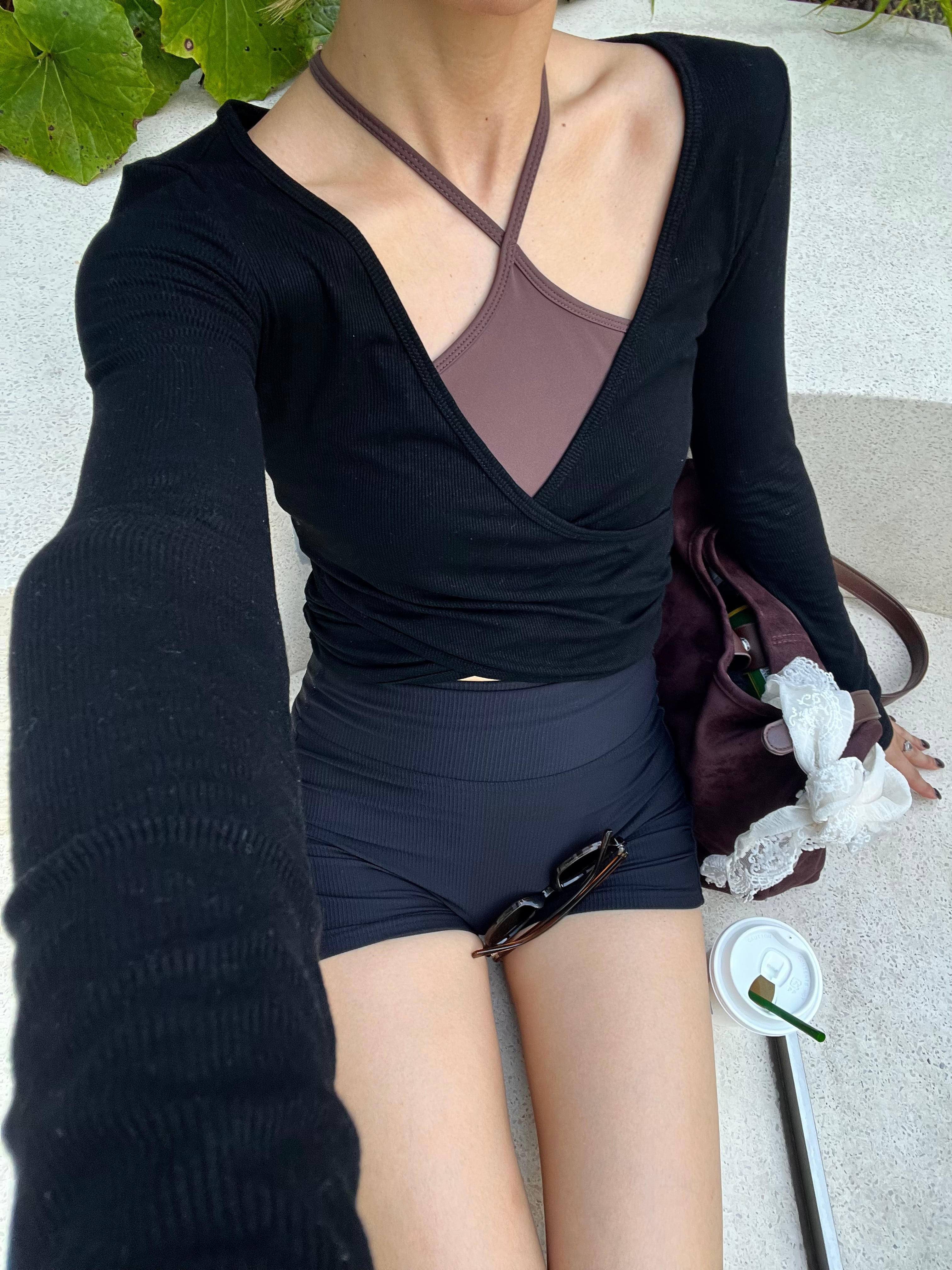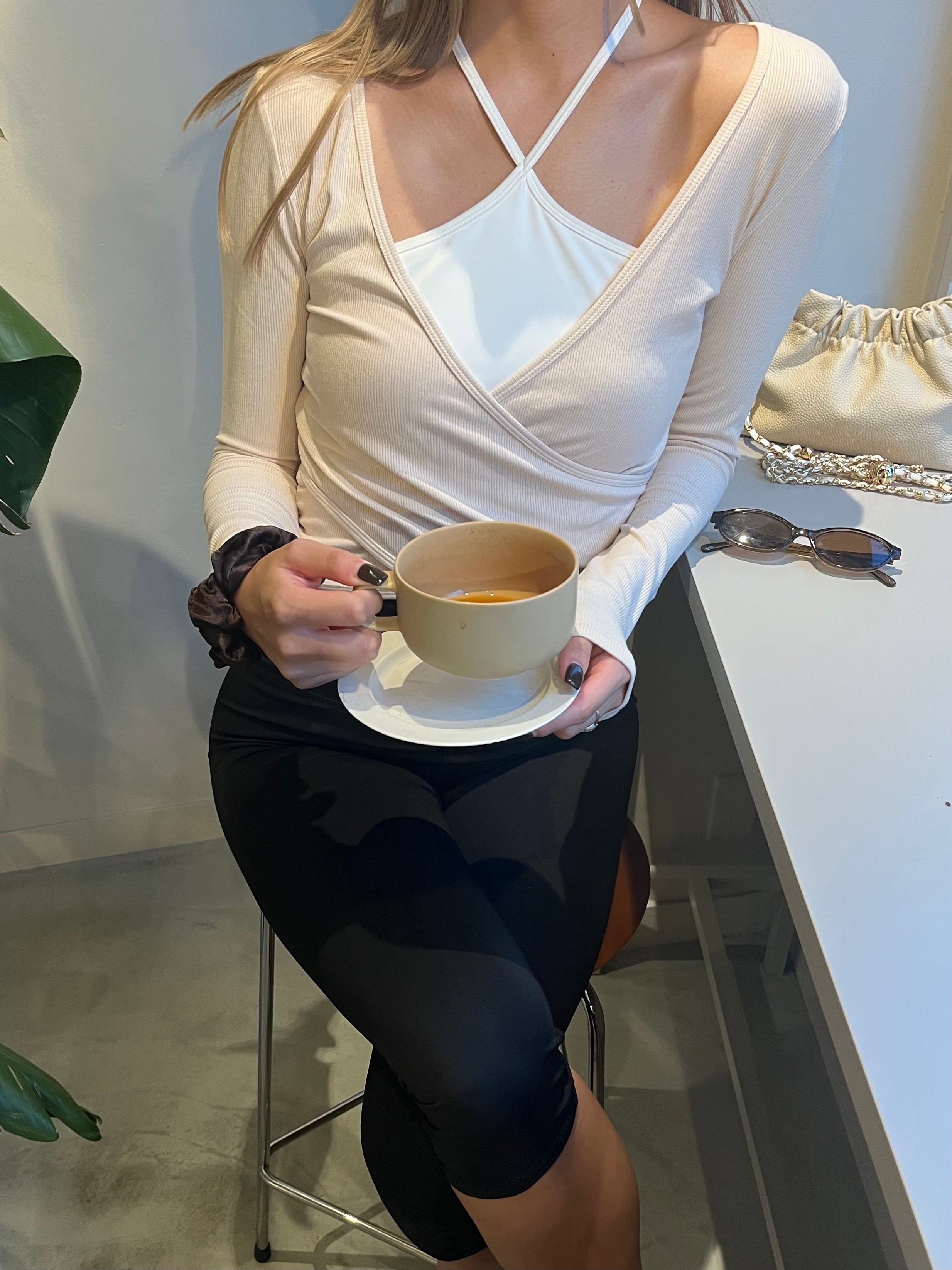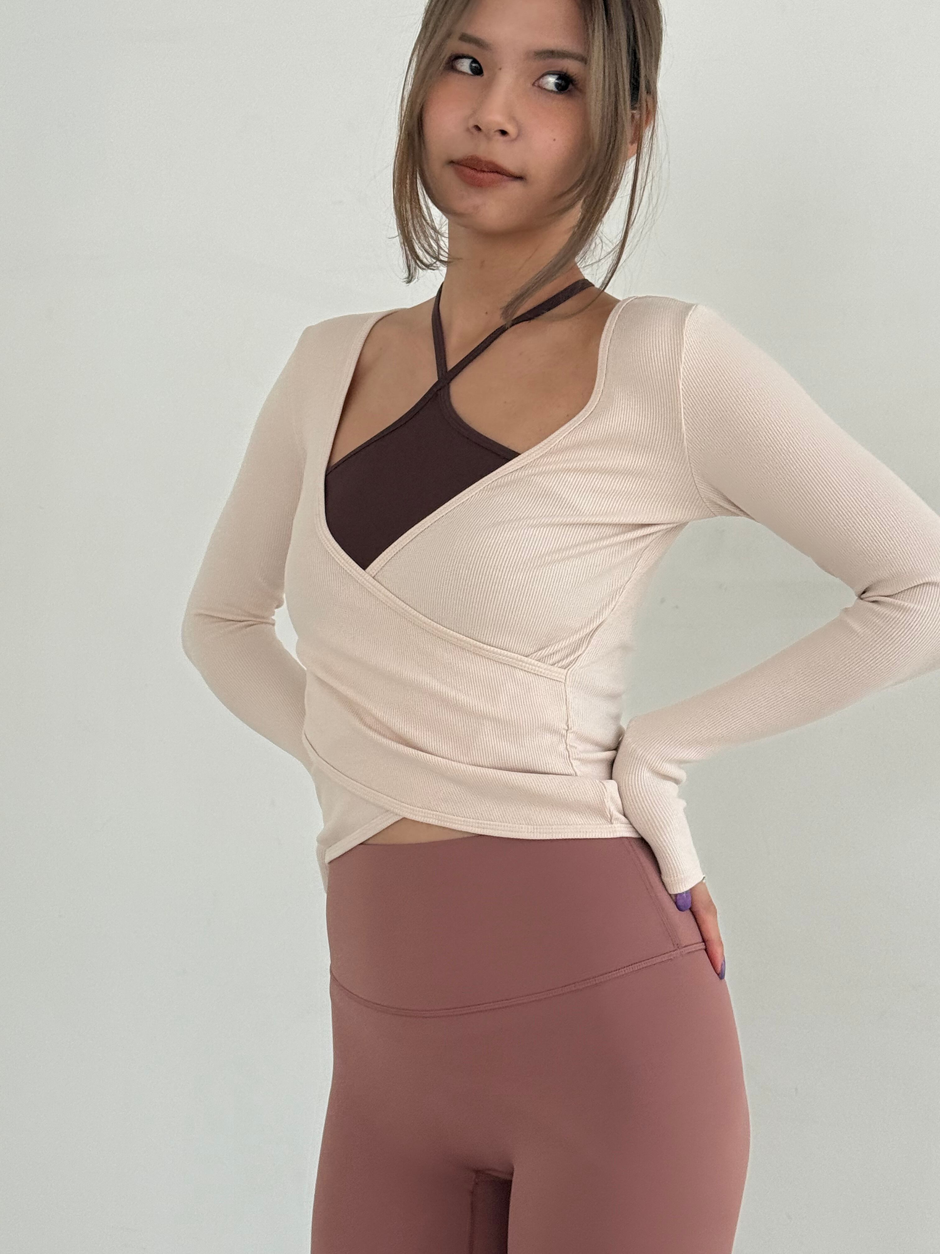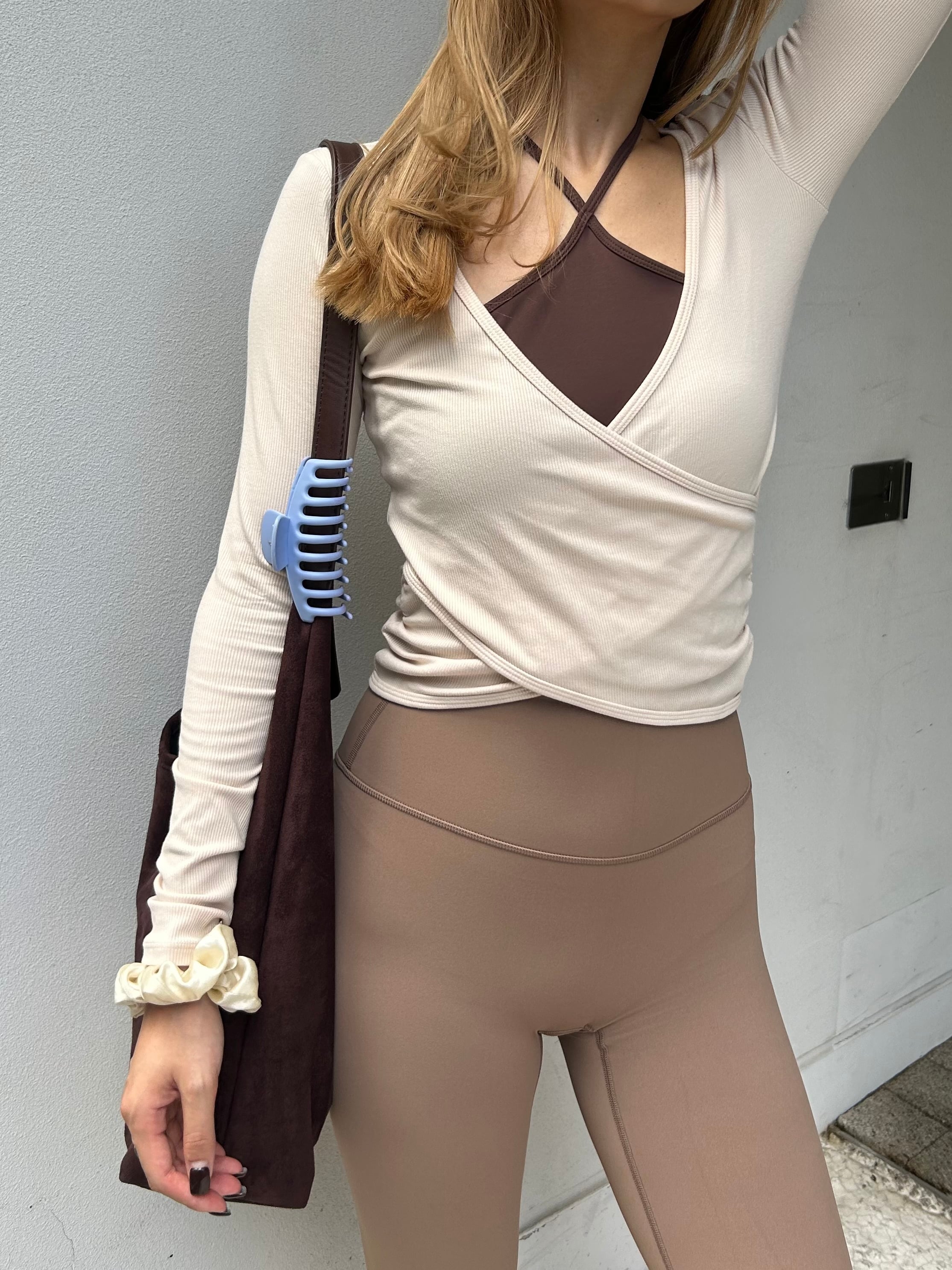 身体のラインを拾うピッタリめのサイズ感ですが、生地のストレッチ性は高いので、とても動きやすいトップスです。